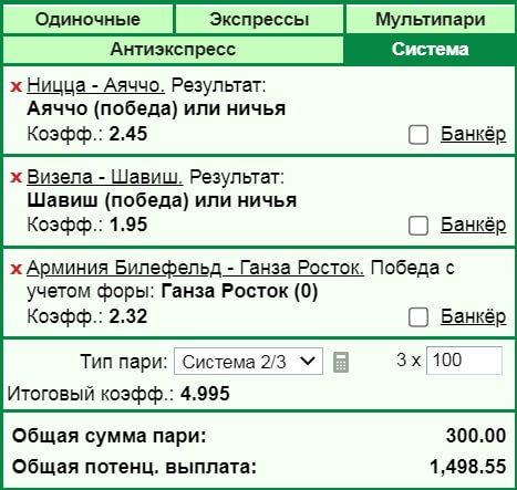 Напоминаем, что ставка типа "Система" принесёт прибыль даже в случае прохода двух позиций из трёх, а ставки вида "Экспресс" можно сделать в нашем виртуальном букмекере, доступном всем зарегистрированным пользователям. Больше статей о ставках, прогнозах, анонсах туров ТОП-чемпионатов и многом другом из мира аналитики на нашем сайте можно найти по этой ссылке.
