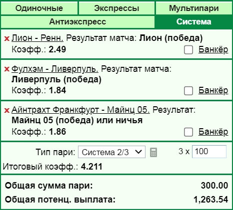 Напоминаем, что ставка типа "Система" принесёт прибыль даже в случае прохода двух позиций из трёх, а ставки вида "Экспресс" можно сделать в нашем виртуальном букмекере, доступном всем зарегистрированным пользователям. Больше статей о ставках, прогнозах, анонсах туров ТОП-чемпионатов и многом другом из мира аналитики на нашем сайте можно найти по этой ссылке.