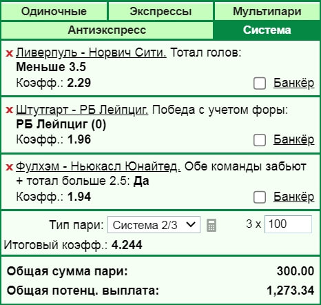 Напоминаем, что ставка типа "Система" принесёт прибыль даже в случае прохода двух позиций из трёх, а ставки вида "Экспресс" можно сделать в нашем виртуальном букмекере, доступном всем зарегистрированным пользователям. Больше статей о ставках, прогнозах, анонсах туров ТОП-чемпионатов и многом другом из мира аналитики на нашем сайте можно найти по этой ссылке.