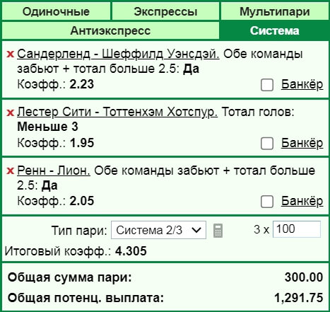 Напоминаем, что ставка типа "Система" принесёт прибыль даже в случае прохода двух позиций из трёх, а ставки вида "Экспресс" можно сделать в нашем виртуальном букмекере, доступном всем зарегистрированным пользователям. Больше статей о ставках, прогнозах, анонсах туров ТОП-чемпионатов и многом другом из мира аналитики на нашем сайте можно найти по этой ссылке.