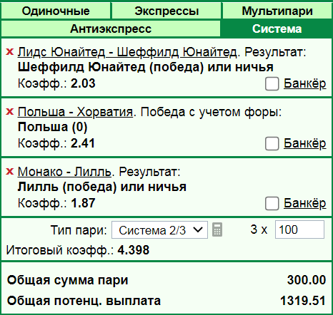 Напоминаем, что ставка типа "Система" принесёт прибыль даже в случае прохода двух позиций из трёх, а ставки вида "Экспресс" можно сделать в нашем виртуальном букмекере, доступном всем зарегистрированным пользователям. Больше статей о ставках, прогнозах, анонсах туров ТОП-чемпионатов и многом другом из мира аналитики на нашем сайте можно найти по этой ссылке.