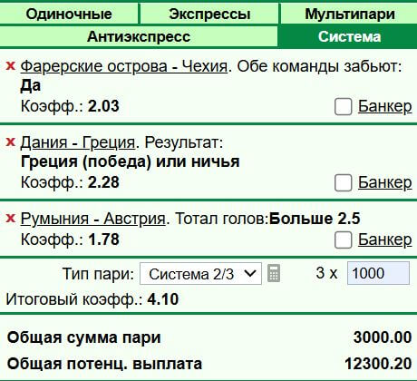 В прошлом материале этой рубрики выигрышной оказалась предложенная система. При возврате по двум позициям, высокая результативность встречи Исландии и Украины увеличили общую сумму этой ставки почти в два раза. В предложенном экспрессе подвела сборная Швеции, без шансов проигравшая команде Швейцарии. В разделе "Ставки на спорт" эксперты ежедневно размещают прогнозы на отдельные матчи, а в этой статье мы в очередной раз соберём ставки следующих видов: экспресс и система из трёх вариантов.