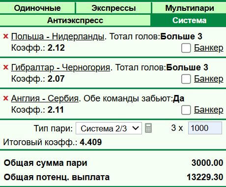 Напоминаем, что ставка типа "Система" принесёт прибыль даже в случае прохода двух позиций из трёх, а ставки вида "Экспресс" можно сделать в нашем виртуальном букмекере, доступном всем зарегистрированным пользователям. Больше статей о ставках, прогнозах, анонсах туров ТОП-чемпионатов и многом другом из мира аналитики на нашем сайте можно найти по этой ссылке.